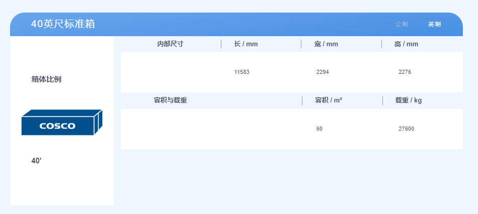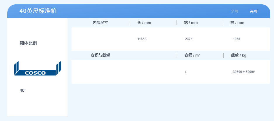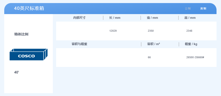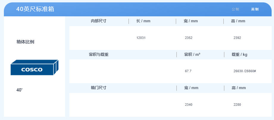 40英尺集裝箱,體積是2.3米寬,2.3米高,12米長,最大貨物載重約28噸。