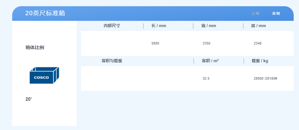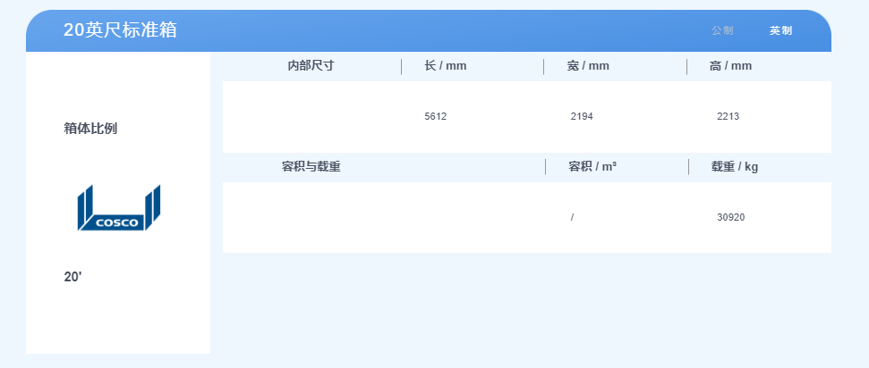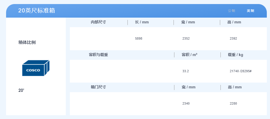 20英尺集裝箱,體積是2.3米寬,2.3米高,6米長,最大貨物重量約28噸;