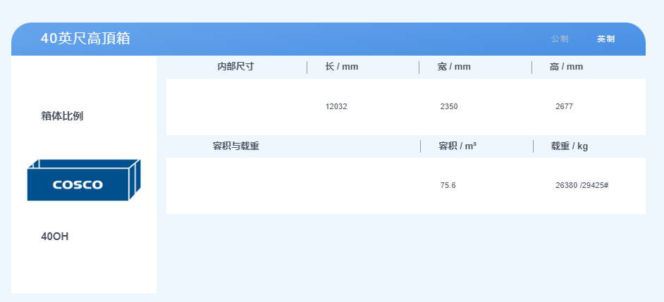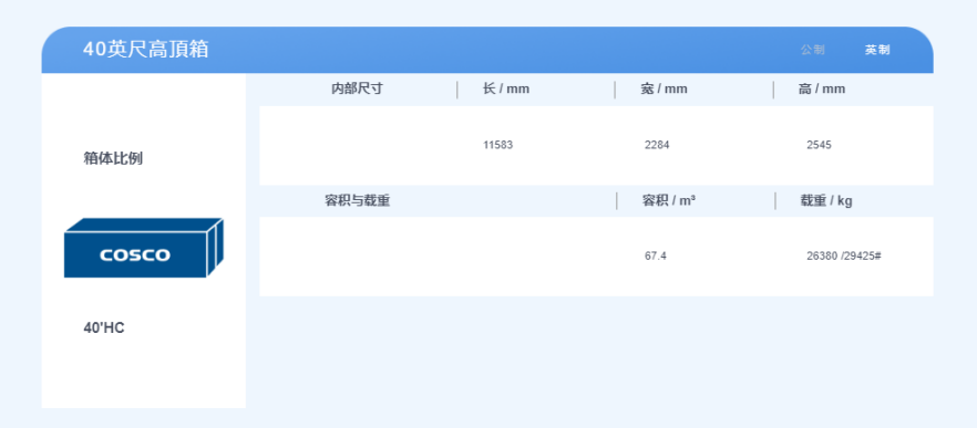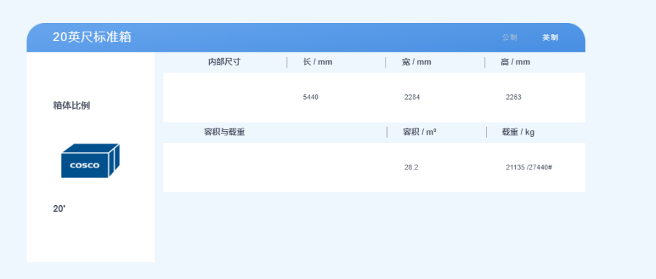 特別備注:最大貨物載重可能會根據每個國家的交通道路法而有所不同,當實際運輸貨物時,需查看貨運運輸涉及地區的交通道路法。單位換算進制數字會有細小的差別,實際操作中同規類型標準集裝箱的尺寸差別不大。